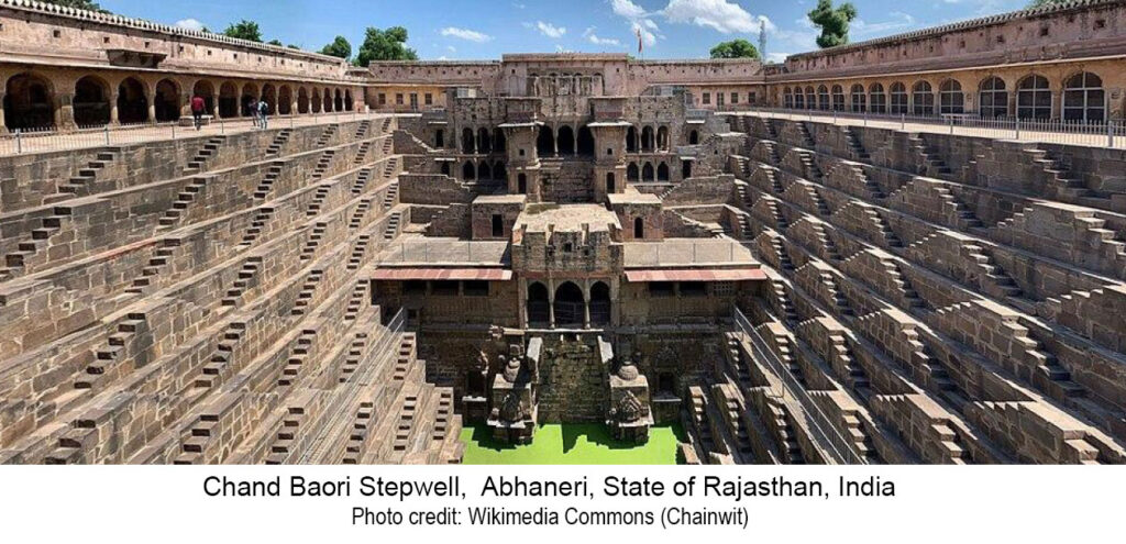 Did you know that there are over 3,000 stepwells in India with many others in arid countries? Water wells are typically constructed or drilled as simple vertical shafts. However, a stepwell is a large diameter excavation constructed to reach permanent groundwater. Access to the wellwater is via a series of stone steps down from the surface to the well water. At a time of low groundwater, it takes several staircases of steps down to reach the water level.